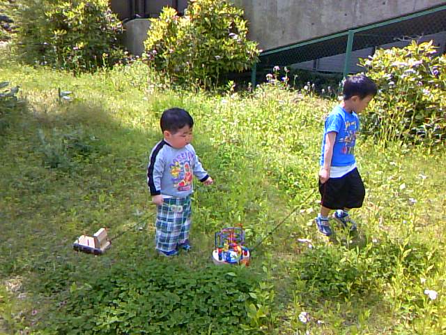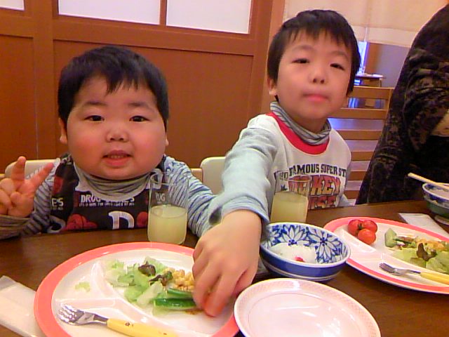 尿タンパク(-)。泰成は旅の疲れも見せず、朝から元気に遊んでいます。晃成は疲れているようです。
