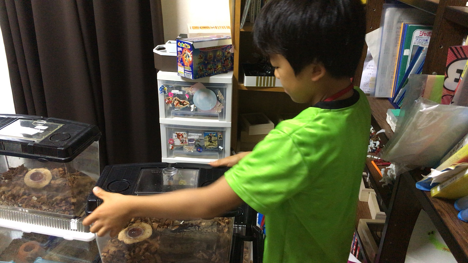*夏休みになりました。晃成は、久しぶりにゆっくりと虫と戯れています。
