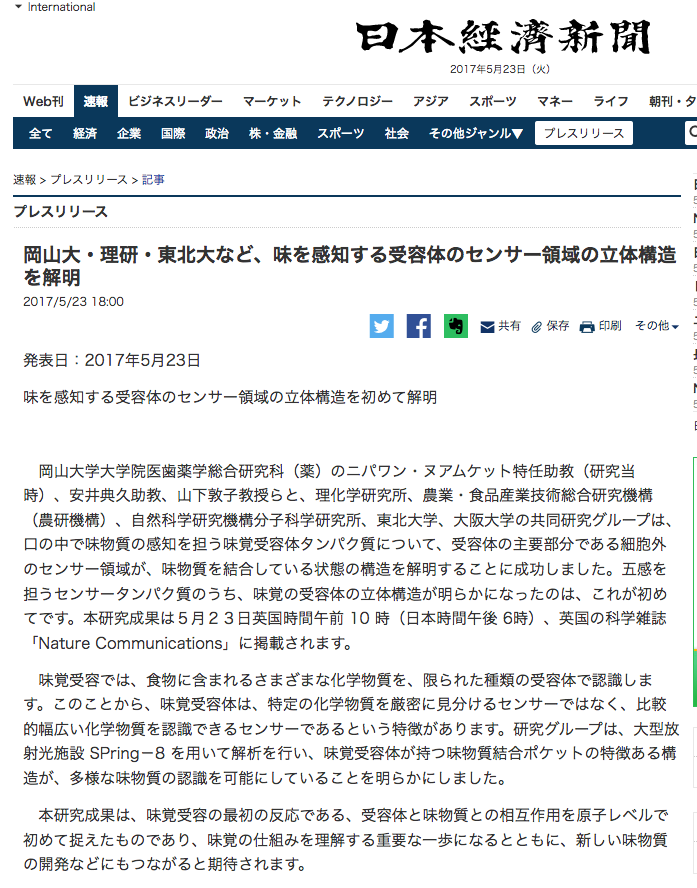 味を感知する受容体のセンサー領域の立体構造を初めて解明