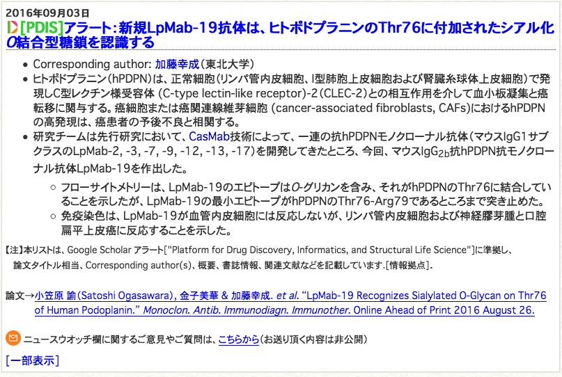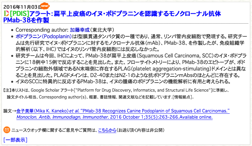 Cornell University College of Veterinary Medicineの研究者から、PMab-38 (anti-canine PDPN mAb)の譲渡依頼がありました。やはり、論文のopen accessをすると、海外からの問い合わせが増えます。