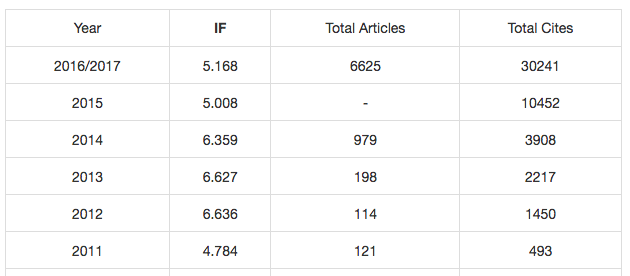 ScopeのCiteScore。トムソンロイターのImpact factorとほぼ同じ値ですので、参考にMABを調べてみました。Impact factorが復活するまでは、この値を参考にしてください。
