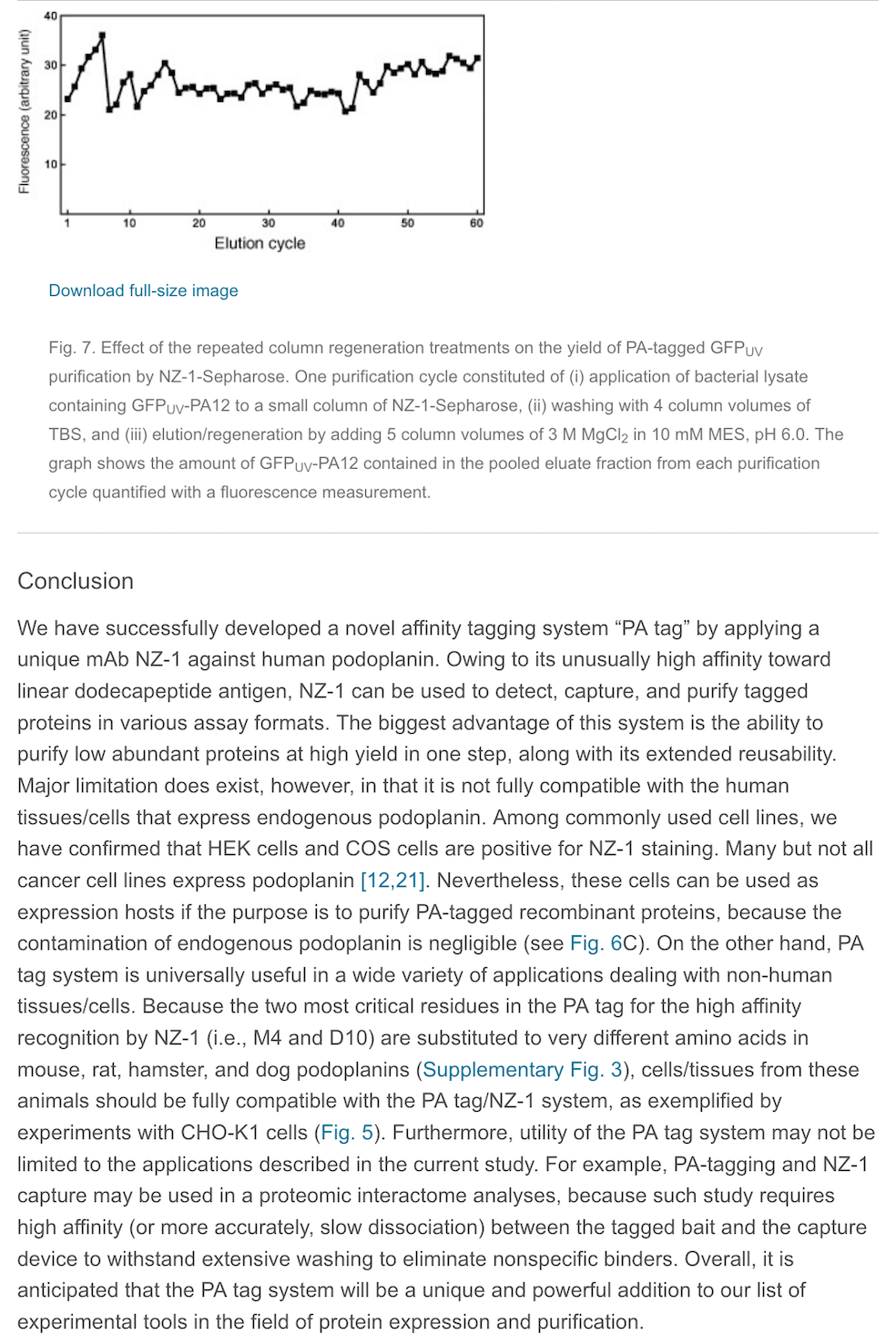 PA tag: a versatile protein tagging system using a super high affinity antibody against a dodecapeptide derived from human podoplanin. Protein Expr Purif. Volume 95, 240-247, 2014 (pdf)